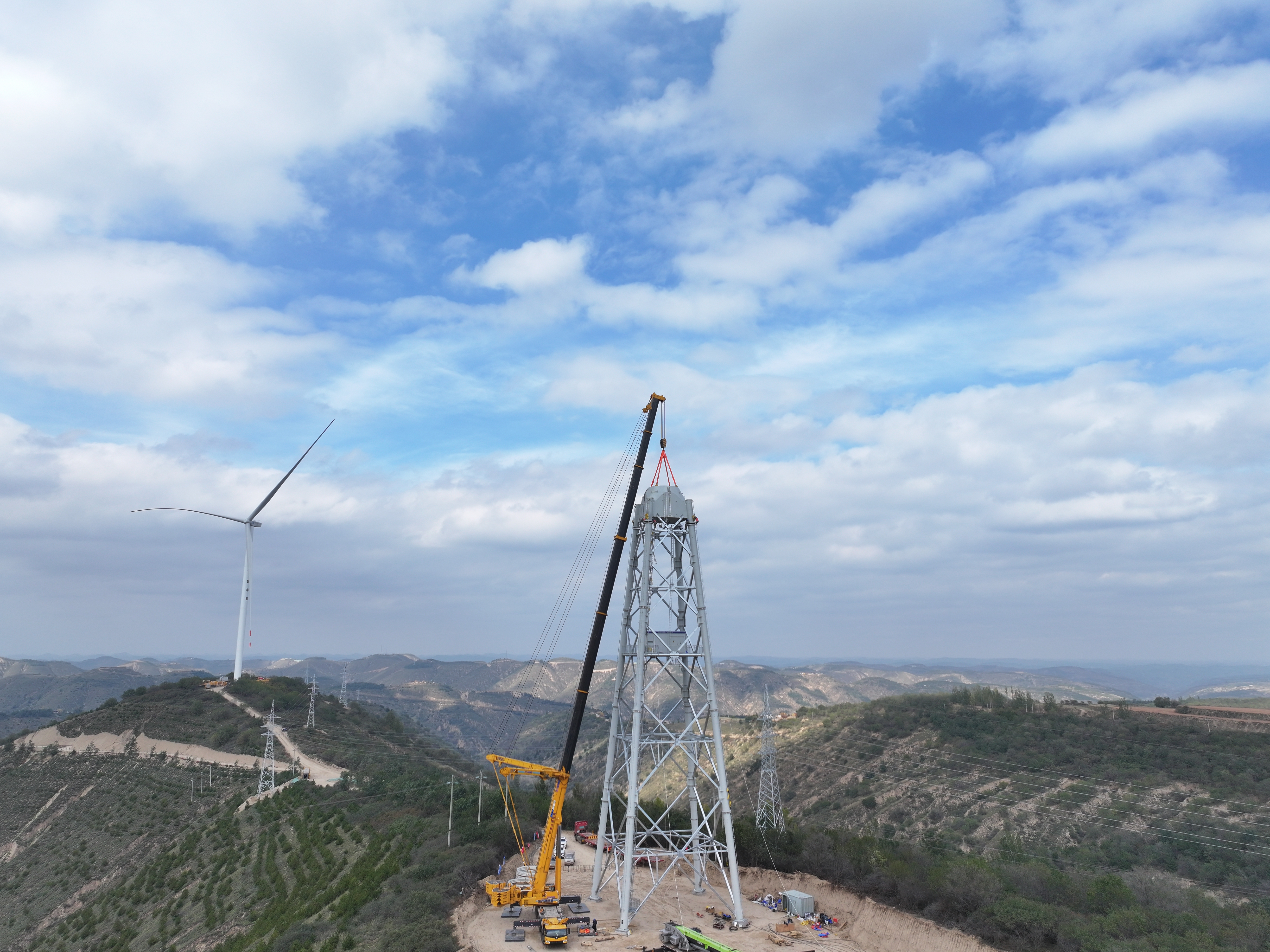 該項目是目前全球在建的最大的構(gòu)架式風塔項目,也是構(gòu)架式風塔在黃土高坡的第一個風電項目,規(guī)劃建設27臺構(gòu)架式風電機組,總裝機容量15萬千瓦。該項目進行多重創(chuàng)新,實現(xiàn)了節(jié)地、低噪、高效、智能,特別是構(gòu)架式風塔與35千伏首級塔的合一設計,展現(xiàn)了風力發(fā)電領域的技術進步和效率提升。