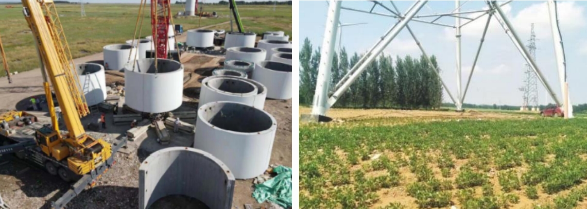 在行洪區(qū),構(gòu)架式塔架底部架空設(shè)計(jì),基礎(chǔ)柱頭露出地面僅6-10平米,柱墩直徑約1500mm,基礎(chǔ)根開15-20米,不影響行洪要求,可實(shí)現(xiàn)箱變上塔,解決箱變泡水問(wèn)題。在風(fēng)電技改場(chǎng)景中,進(jìn)行風(fēng)電機(jī)組的退役改造需求,實(shí)現(xiàn)了跨原基礎(chǔ)建設(shè),這一創(chuàng)新方案不僅有效節(jié)省了拆除原基礎(chǔ)的成本,還顯著縮短了改造工程的施工周期。