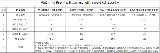 以菏澤鄄城160米項目為例,與菏澤華潤和明陽140米剛性混塔進行成本對比,具體見下表: